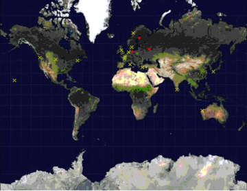 The geographic distribution of the most commonly known large radio transmitter stations (mostly for national navy and other larger institutions or agencies operating) below 30 kHz are shown as yellow crosses on the world map besides. Further details (call signs, frequencies and locations) on those stations are available as ASCII text document here. Most of them can be received by the InFlaMo network (InFlaMo SID monitor stations are marked as red dots).